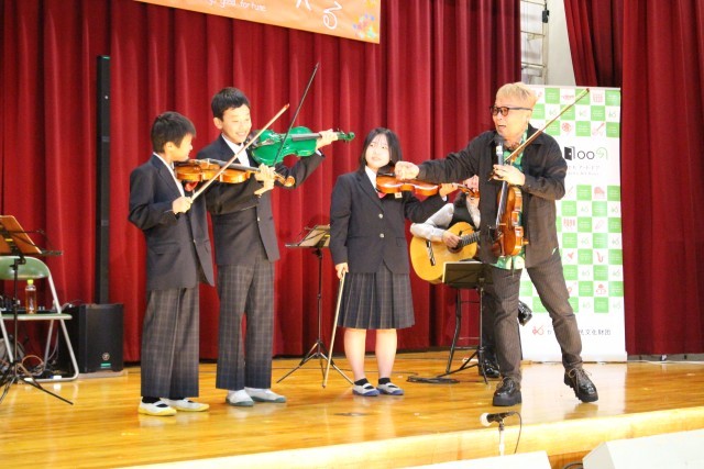 途中、代表の生徒が舞台でバイオリン体験をしたり、ブラシを使ったダンスを一緒に踊ったりと、みんなで楽しく過ごす時間となりました。