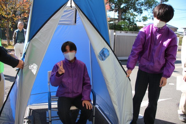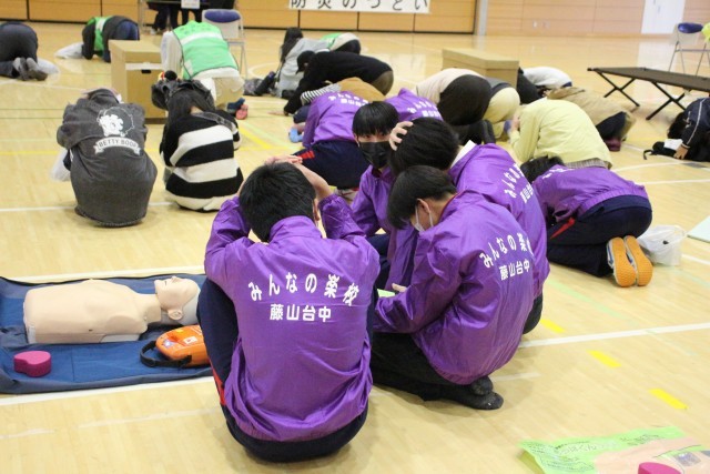 今年は新しい取り組みとして、避難所の段ボールベッド・間仕切りを組み立てて仕組みを学んだり、実際の119番のオペレーターの方に救急電話をかけて、臨場感さながらに連絡の練習をしたりしました。地域の方もたくさん参加していただき、地震や事故の被害を少しでも減らす知識を身につけることができました。藤山台中の生徒は、各ブースや運営のお手伝いを立派に勤めていました。