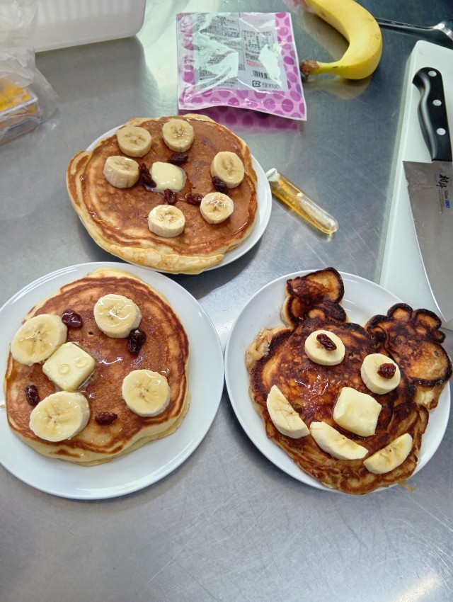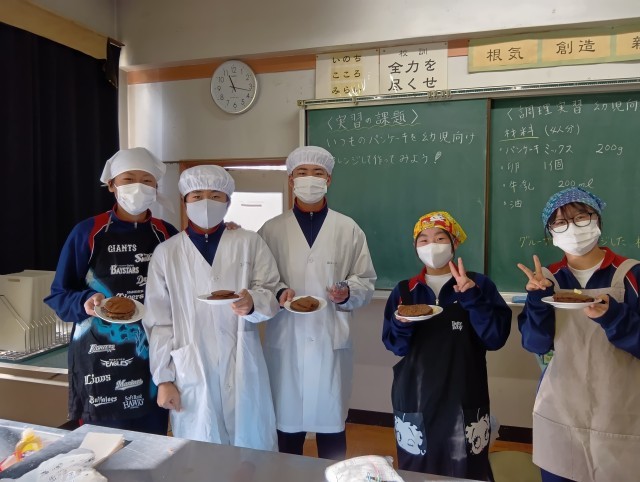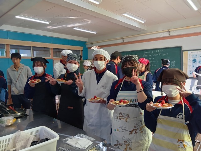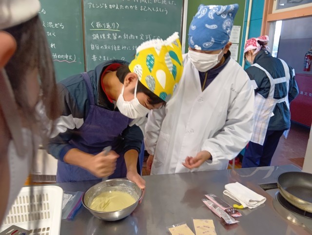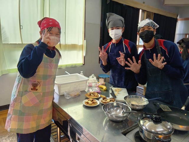 3年生が調理実習を行いました。それぞれの班で工夫を凝らしてパンケーキ作りをしました。絵をかいたり、フルーツを添えたり、楽しく作り、そのあとはおいしくいただきました。自分で作ると、さらにおいしくなりますね!