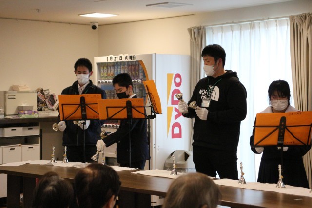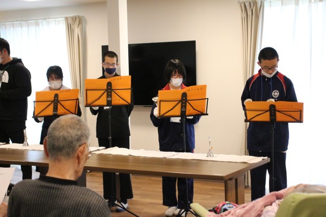 午後にはこれまで練習してきたハンドベルを演奏して、利用者さんと交流をしました。「春」や「ふるさと」など懐かしい日本の曲を演奏したので、皆さん一緒に歌ってもらえて嬉しかったですね。近くにこのような素敵な施設があることも知り、とても勉強になりました。