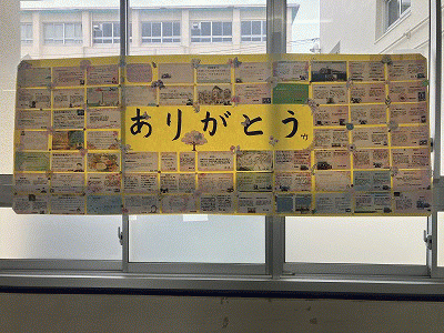 校門で元気に挨拶をしてくれました。昇降口には、送る会で1・2年生とやり取りした温かいメッセージが並んでいます。