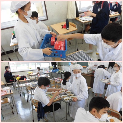 全員登校となり元気なあいさつの数が先週の倍になったので、朝のさわやかさも倍になりました。給食もはじまりまりました。4時間目が終わると全員がせっけんを使って手をよく洗い、給食当番も消毒回数を増やしたり配膳方法を工夫したりするなど、感染予防を意識しながら協力して手際よく準備をすることができました。