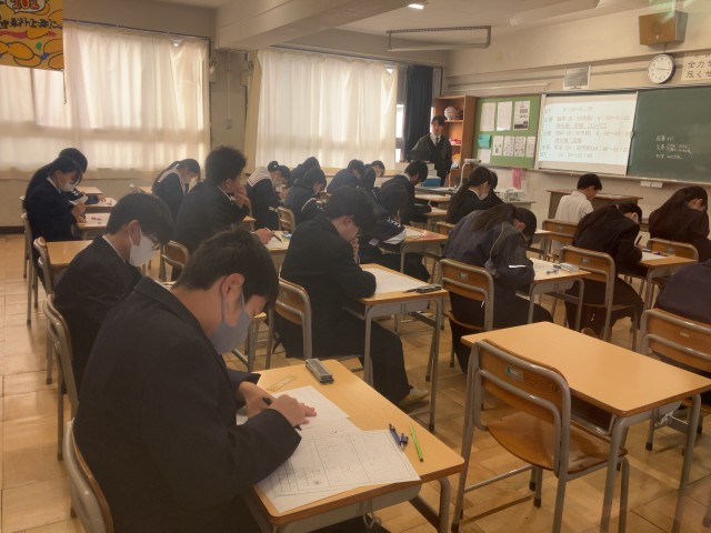 今日は第4回テストの最終日です。写真は、数学のテストに臨む1年生の様子です。中学...