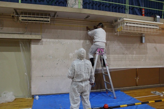 本日、学校運営協議会のボランティアの方々により、体育館の壁面補修がはじまりました...