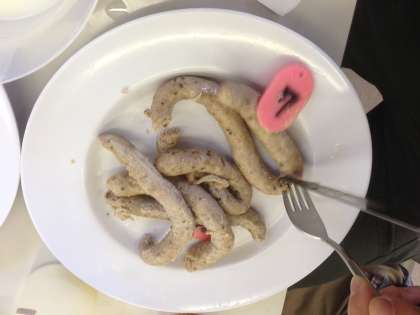 ソーセージが茹で上がりました。 普段スーパーで売っているものと色がだいぶ違います。