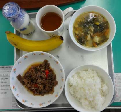 今日のメニューです。 ・ごはん ・牛乳 ・わかめスープ ・プルコギ ・バナナ