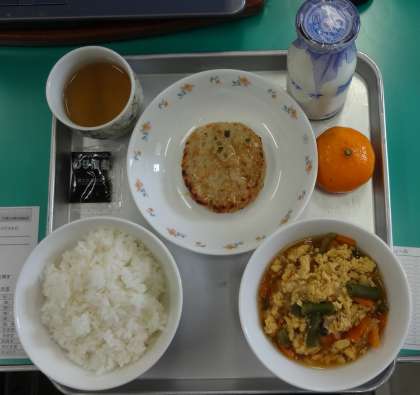 今日の給食です!〈6月11日(火曜)〉 公開日 2013/06/11 更新日 2013/06/11 学校だより 今日のメニューです。 ・ごはん ・牛乳 ・卵とじ ・愛知のハンバーグのたれかけ ・冷凍みかん ・のりつくだ煮