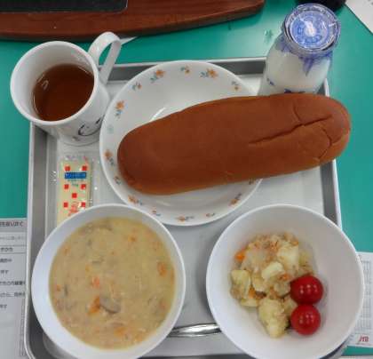 今日の給食です!〈6月13日(木曜)〉 公開日 2013/06/13 更新日 2013/06/13 学校だより 今日のメニューです。 ・くろロールパン ・牛乳 ・白いんげんのポタージュ ・コロコロポテトサラダ ・ミニトマト(2個) ・小袋マヨネーズ