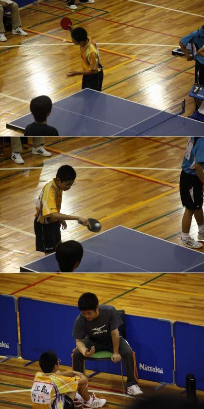個人戦シングルスに出場の江島健介君は、1回戦、東郷中の選手と戦いましたが、1−3で惜敗しました。愛知地区の強敵に大健闘でした。まだ2年生。これからもがんばってください!