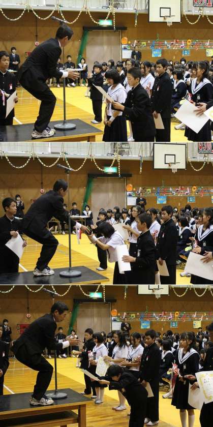 合唱コンクールがんばりました!〈1年〉 公開日 2013/10/31 更新日 2013/10/31 学校行事 1年生 最優秀 4組「心の瞳」指揮 渡辺葵 ピアノ 宮崎真帆 優秀 2組「怪獣のバラード」指揮 加藤雅大 ピアノ 小栗広大