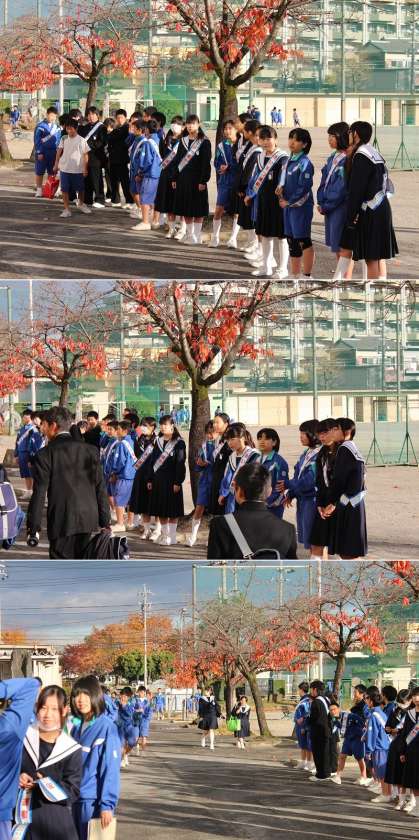 あいさつ運動2日目です! 公開日 2013/11/26 更新日 2013/11/26 生徒会 11月26日(火曜)、昨日より寒い朝になりました。 今日の当番は、1年2組、2年2組です。 寒さのせいか、心なしあいさつの声が小さくなったような…。 寒さを吹き飛ばすような元気な声であいさつしようね!