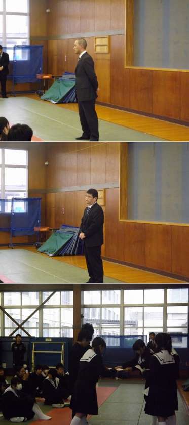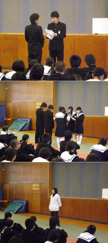 12月18日(水曜)6限、3年生が学年集会を行い、冬休み中の生活・学習について先生方からお話しがありました。