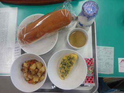 話題の米粉パンです!〈1月15日(水)〉 公開日 2014/01/15 更新日 2014/01/15 学校だより 3年生はテストのため食べられなかったメニューです。 ・あいちの米粉パン ・牛乳 ・じゃがいものバター煮 ・ほうれん草入りオムレツ ・小袋ケチャップ