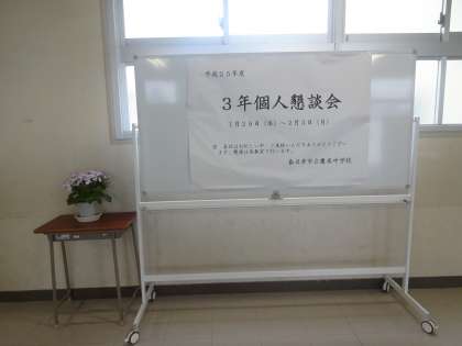 3年個人懇談会2日目です! 公開日 2014/01/30 更新日 2014/01/30 学校行事 1月30日(木曜)、3年生の個人懇談会2日目です。 朝から雨が降り続き、寒い日になりました。校舎内、特に廊下は大変冷え込んでいます。暖かくしてご来校ください。