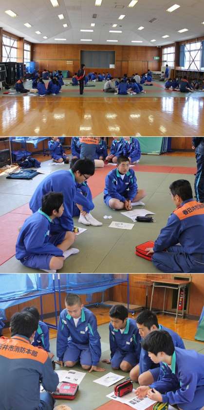 救急法の授業を行いました! 公開日 2014/02/05 更新日 2014/02/05 学校だより 2月5日(水曜)、2年生の時間割を変更し、1クラスずつ2時間続きの体育授業の中で救急法を学びました。 講師は消防署員さん。8名の署員さんから、心臓マッサージやAEDなど心肺蘇生法を丁寧に教えていただきました。ありがとうございました。 授業は明日も行われます。