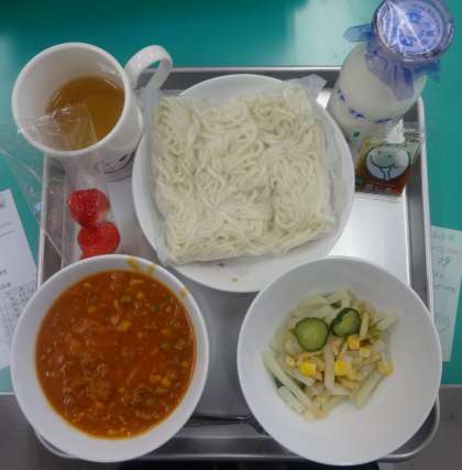 今日の給食です!〈2月27日(木)〉 公開日 2014/02/27 更新日 2014/02/27 学校だより 今日のメニューです。 ・ソフトめん ・牛乳 ・ミートソース ・シャキシャキポテトサラダ ・いちご ・小袋しょうゆドレッシング