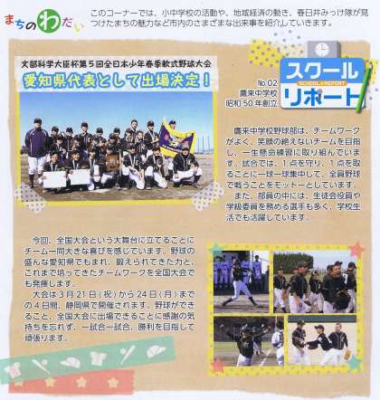 広報に掲載されました! 公開日 2014/03/02 更新日 2014/03/02 学校だより 広報春日井3月1日号「スクールリポート」に鷹来中学校が掲載されました。 野球部の全国大会出場が大きく取り上げられています。ぜひ、ご覧ください!