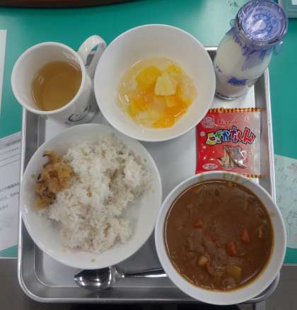 ・麦ごはん ・牛乳 ・カレーシチュー ・フルーツミックス