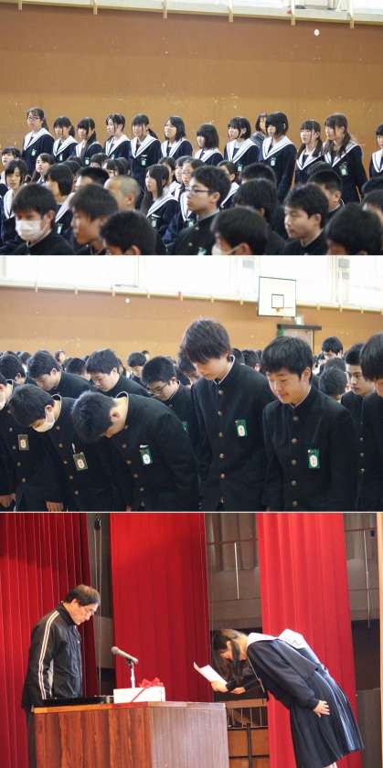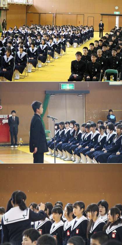 卒業式練習を行いました!〈3月4日(火)〉 公開日 2014/03/04 更新日 2014/03/04 学校行事 3月4日(火曜)5限に、2・3年生合同で卒業式練習を行いました。 代表生徒と動きを合わせる練習や歌の練習などを念入りに行いました。 明日は1・2限にリハーサルが行われます。