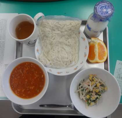 今日のメニューです。 ・ソフトめん ・牛乳 ・ミートソース ・ごぼうサラダ ・きよみ