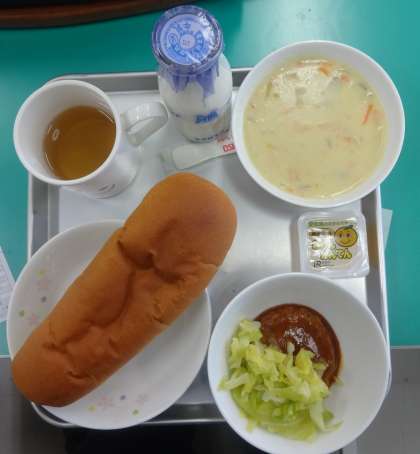 今日の給食です!〈3月19日(水)〉 公開日 2014/03/19 更新日 2014/03/19 学校だより 今日のメニューです。 ・バターロールパン ・牛乳 ・白いんげんのポタージュ ・ハンバーグのデミグラスソースかけ ・ボイルキャベツ ・みかん寒天