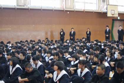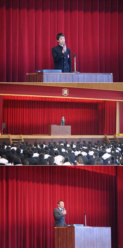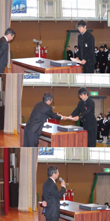 修了式を行いました! 公開日 2014/03/24 更新日 2014/03/24 学校行事 3月24日(月曜)、平成25年度修了式を行いました。 1年、2年それぞれの代表生徒が修了証を受け取った後、校長先生からのお話です。 校長先生からは昨日までの野球全国大会で、マナーの大切さを教えられた、という話などをお話しされました。 生徒会長、佐藤先生の話の後、坂田先生から全国大会出場のお礼のお話もありました。