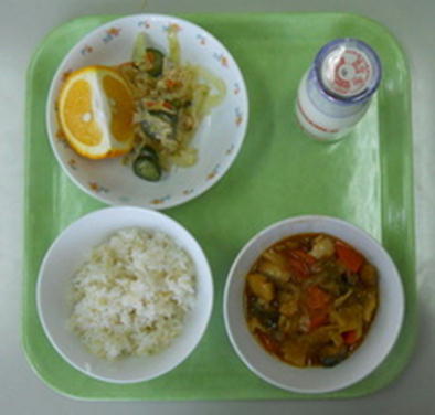 今日のメニューです。 ・発芽玄米ごはん ・牛乳 ・白身魚の甘酢あん ・寒天サラダ ・あまなつ