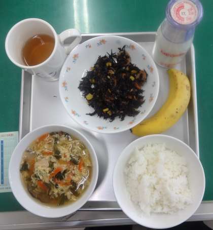今日のメニューです。 ・ごはん ・牛乳 ・卵汁 ・ひじきの煮物