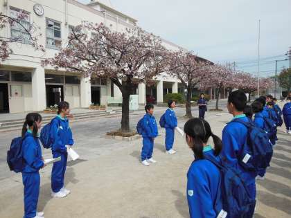 今日は1年生の校外学習です。出発式を終え、バスで春日井少年自然の家に向けて出発しました。