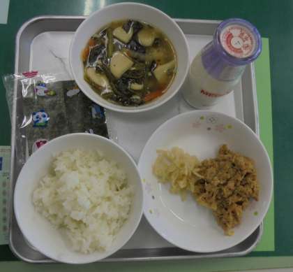 今日の給食です。〈4月24日(木)〉 公開日 2014/04/24 更新日 2014/04/24 学校だより 今日のメニューです。 ・ごはん ・牛乳 ・吉野汁 ・まぐろの甘辛煮 ・きざみたくあん ・手巻きのり