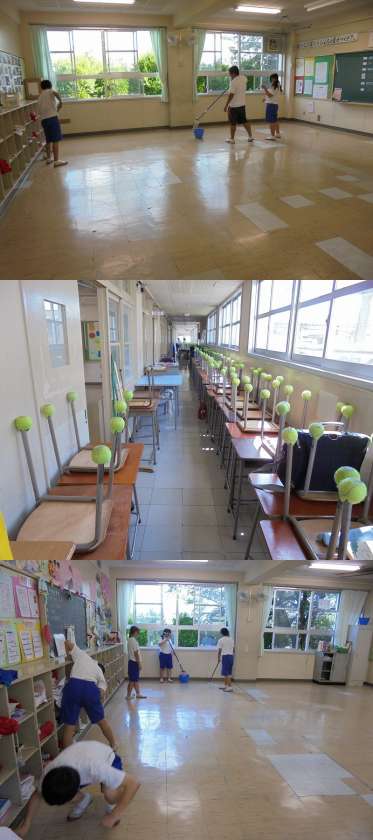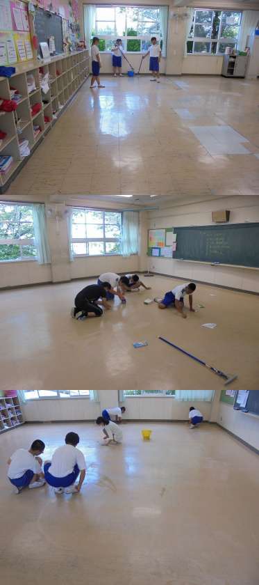 教室ワックスがけ〈7月1日(火)〉 公開日 2014/07/01 更新日 2014/07/01 学校だより ST後、全クラスで教室のワックスがけを行いました。ワックスをかける前に、床の水拭きやひどい汚れをスポンジを使ってきれいにする作業はとても大切です。