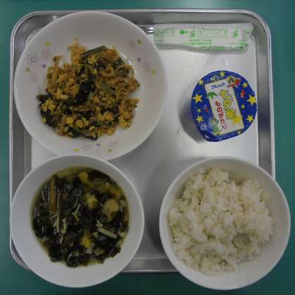 今日のメニューです。 ・麦ごはん ・牛乳 ・えびとわかめのスープ ・ビビンバ ・七夕ゼリー