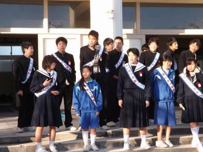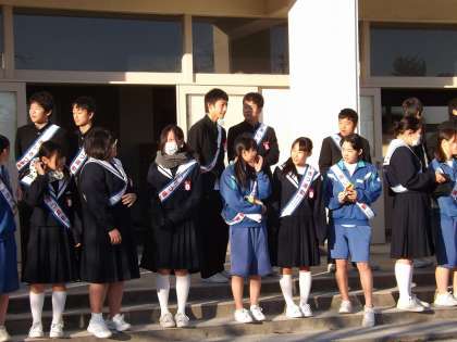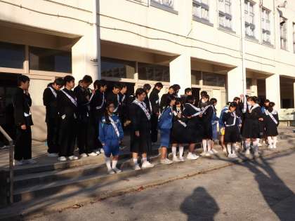 3年2組と7・8組のみなさんです。寒くなってきましたが大きな声で「おはようございます。」