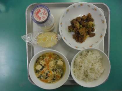 今日のメニューです。 ・麦ごはん ・牛乳 ・卵汁 ・里イモとトリ肉のあげに ・りんご