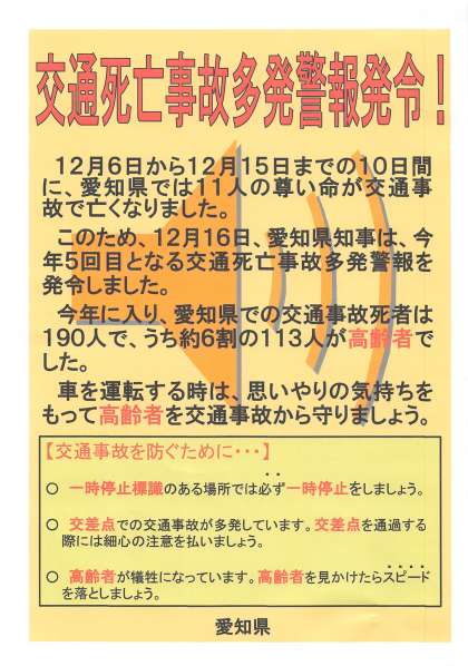 愛知県から交通死亡事故多発警報が発令されています。