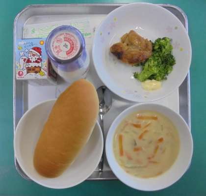 今日の給食です。〈12月19日(金)〉 公開日 2014/12/19 更新日 2014/12/19 学校だより 今日のメニューです。 ・小型ロールパン ・牛乳 ・白いんげんのポタージュ ・照り焼きチキン ・ボイルブロッコリー ・卓上マヨネーズ ・お米のケーキまたはチョコレートケーキ 年内の給食は本日が最終日です。新年は、1月8日(木)から給食が始まります。