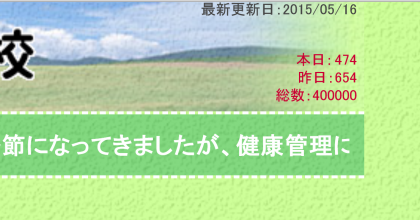 2006年3月18日からの総アクセス数が、5月16日(金)の午後10時26分に40万になりました。鷹来中学校のHPをいつもご覧いただき感謝申し上げます。今後も色々な情報をお伝えしていきますのでよろしくお願いします。