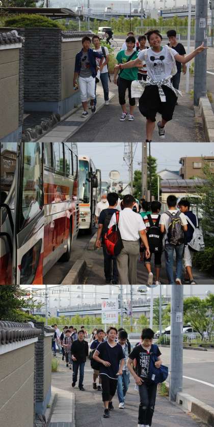 修学旅行1日目(バス出発) 公開日 2015/06/02 更新日 2015/06/02 学校行事 6時45分、バスは生徒の笑顔をいっぱい乗せて、鷹来中学校を出発しました。名古屋駅まで行き、8時40分発の新幹線に乗ります。「行ってらっしゃ〜い!」