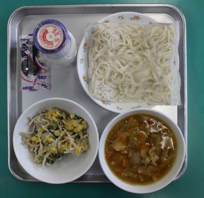 今日のメニューです。 ・ソフトめん ・牛乳 ・中華あんかけ ・ごぼうサラダ ・プルーン