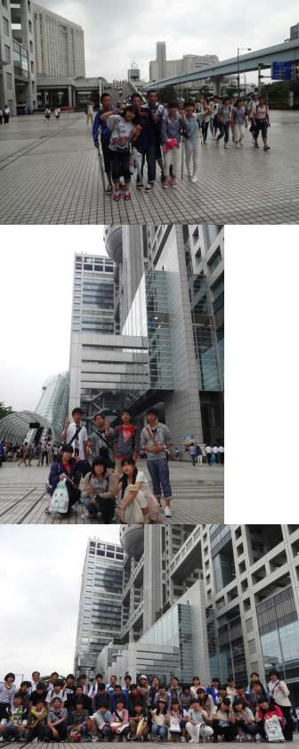 修学旅行2日目(フジテレビ前集合) 公開日 2015/06/03 更新日 2015/06/03 学校行事 研修後の集合場所は、お台場にあるフジテレビ本社前です。すべての班が無事集合できました。14時25分頃、フジテレビ前を山中湖へ向けて出発しました。