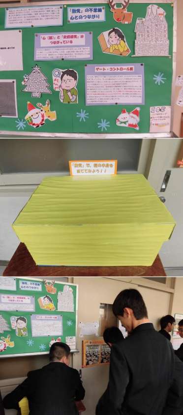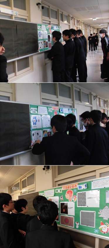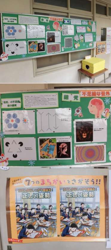 保健室前の掲示板です 公開日 2018/11/06 更新日 2018/11/06 学校だより 11/6(火)放課の様子です。3年生が保健室前の掲示板を見ていました。季節によって様々な情報を掲示しています。現在は「錯覚」です。目について考える機会になるといいですね。