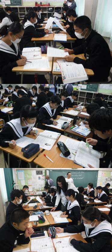 3年授業公開<11/9(金)> 公開日 2018/11/09 更新日 2018/11/09 学校だより 3年5組で英語の授業が公開されました。学習目標は「電話で言伝(ことづて)をお願いしよう」です。電話での会話するときの表現についてキーセンテスを学んだあと、会話練習を行いました。ペアの相手を次々と変えながら、楽しく活動できました。