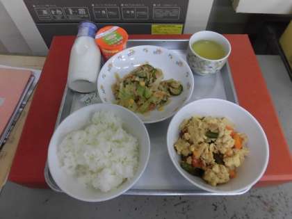 今日の献立は、ごはん、高野豆腐の卵とじ、和風ツナサラダ、野菜ゼリー、牛乳でした。