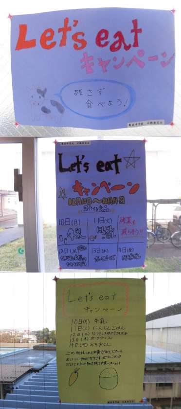 12/10(月)から今週いっぱい、給食委員会が企画した「Let's eat キャンペーン」が行われています。普段から食べている給食を通して、食の大切さを見直すとともに、学校全体で残菜を少しでも減らせるように考えた取り組みです。給食の「いただきます」の前には、各クラスの給食委員が1日1品目、食品の良いところを紹介しています。