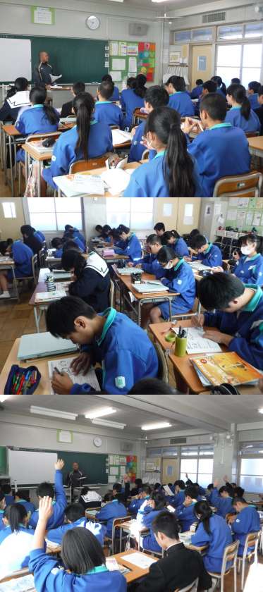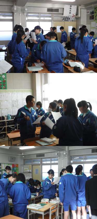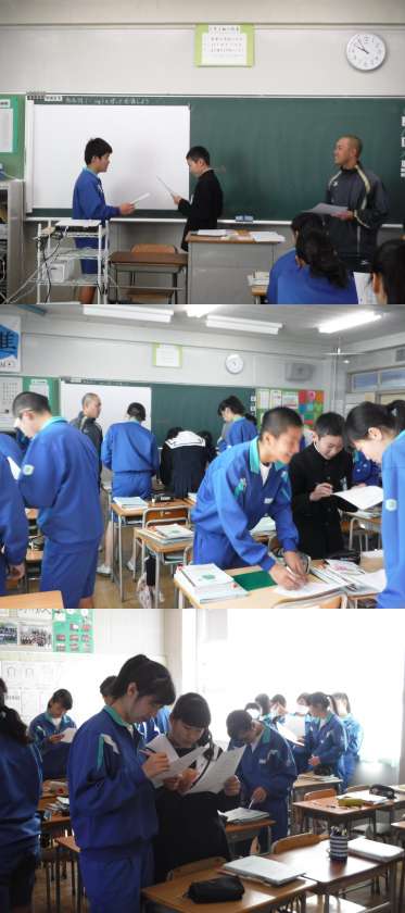 2年授業公開<12/13(木)> 公開日 2018/12/13 更新日 2018/12/13 学校だより 2年3組で英語の授業が公開されました。学習目標は「動名詞(…ing)を使って会話をしよう」です。「Do you like …ing?」の形で互いにインタビューし合い、ビンゴのシートを埋めていきました。生徒たちは、「Yes,I do.」で答えてくれる友だちを探し、意欲的に活動することができました。