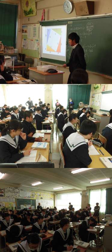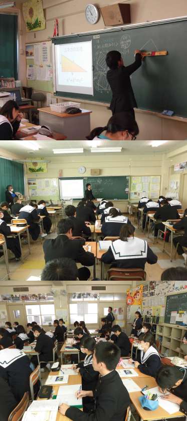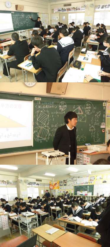 3年授業公開<12/13(木)> 公開日 2018/12/13 更新日 2018/12/13 学校だより 3年4組で数学の授業が公開されました。学習目標は「新しい定理を知ろう」です。ICTを活用し、三平方の定理が成り立つことを計算だけでなく、視覚的に捉えて考えました。3年生らしく授業に集中し、三平方の定理の計算問題にも真剣に取り組みました。