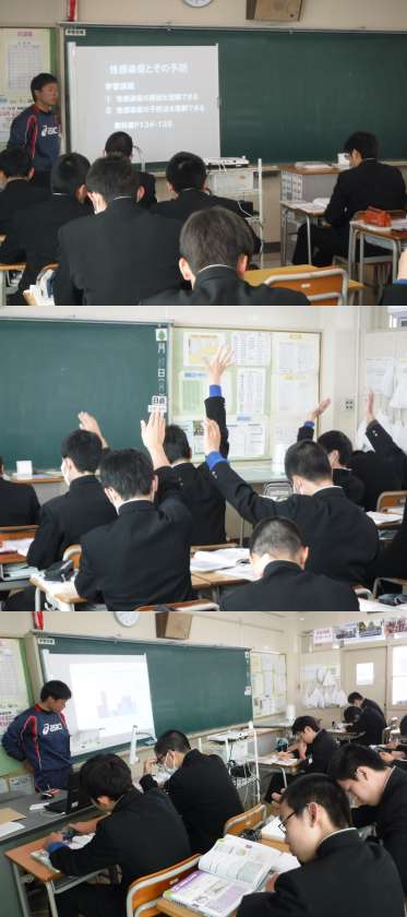 3年授業公開<12/17(月)> 公開日 2018/12/17 更新日 2018/12/17 学校だより 3年3・4組男子の保健体育の授業が公開されました。学習目標は「性感染症の原因と予防法を理解しよう」です。性感染症に関する最新のデータを分析することで性感染症を身近に迫った問題と捉え、感染の原因や予防する方法について理解を深めました。