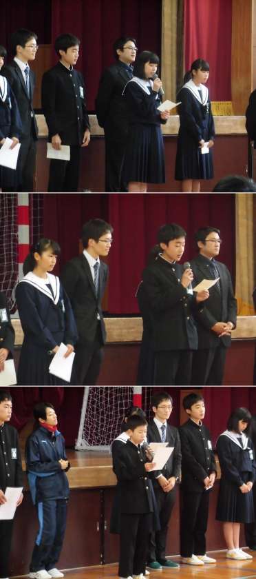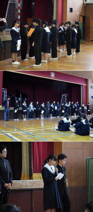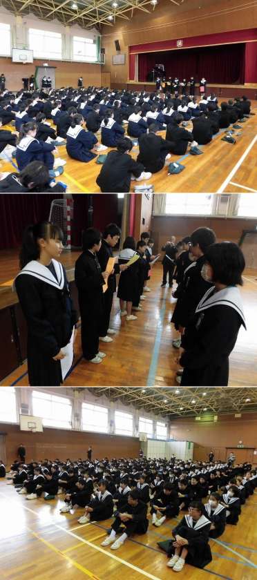 2年学年集会<12/20(木)>その1 公開日 2018/12/21 更新日 2018/12/21 学校だより 12/20(木)6時限、2年生が2学期最後の学年集会を行いました。内容は、2学期のまとめと冬休みの生活についてです。学級委員が司会となって、学年の表彰も行いました。学年としても落ち着き、中心となるリーダーもがんばっています。支えてくれ、協力してくれる学年のみんなのおかげです。3学期も期待しています。