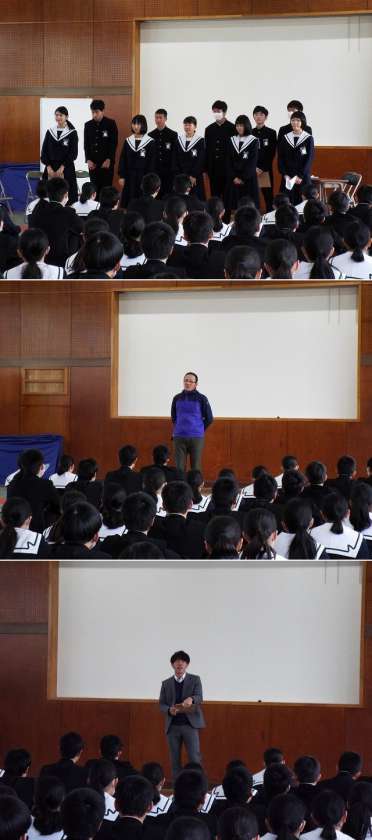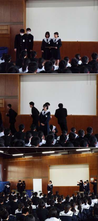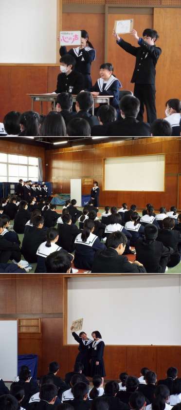 12/20(木)5時限、3年生が2学期最後の学年集会を行いました。内容は、2学期のまとめと冬休みの生活についてです。学級委員はネットモラルについての注意点を、劇で発表してくれました。冬休みが終わり3学期になれば、いよいよ進路決定の時期となります。健康に気を付け、有意義に過ごしてください。