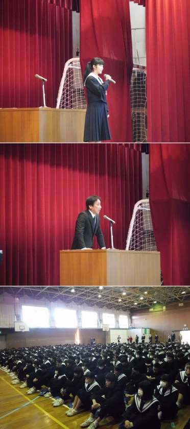 そして、生徒会長から、1日1日を大切に過ごすことと1月の愛颯運動・エコキャップ回収の協力のお願い、生徒指導担当から、目標をもって1年を送ることと、相手を考えた仲間への励まし方についての話がありました。